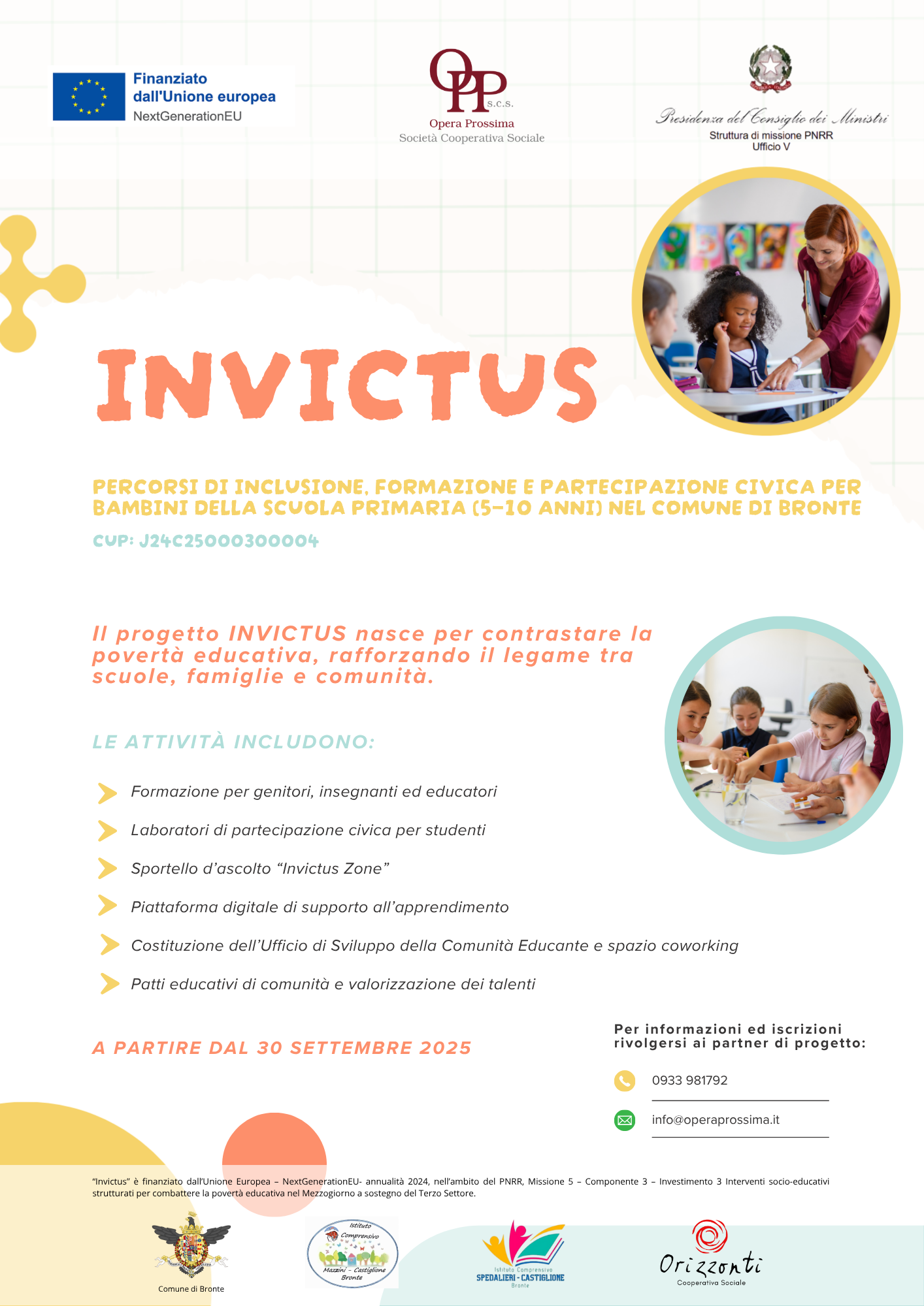 La Cooperativa Opera Prossima s.c.s., in partenariato con il Comune di Bronte, l’Istituto Comprensivo “Mazzini – Castiglione”, l’Istituto Comprensivo ad indirizzo musicale “Spedalieri-Castiglione e la Cooperativa sociale Orizzonti, annuncia l’avvio del progetto INVICTUS.